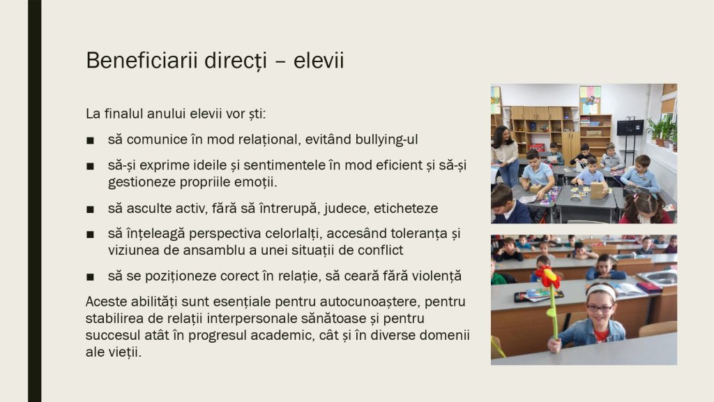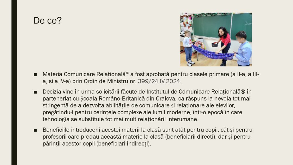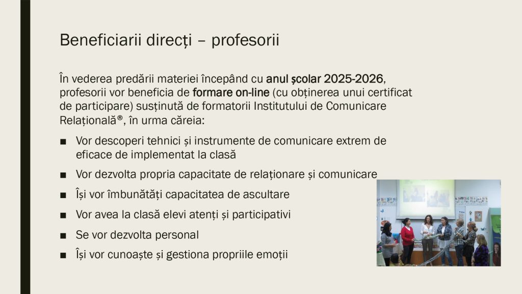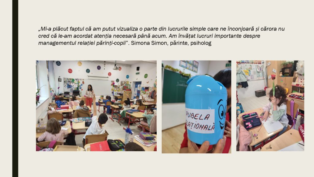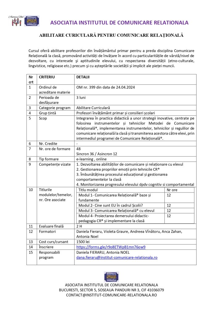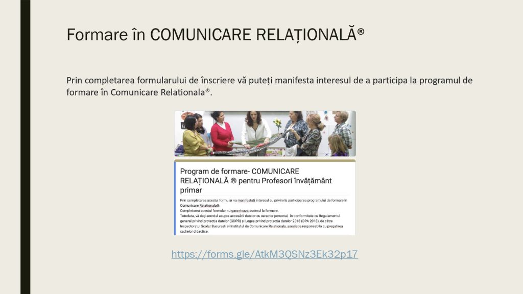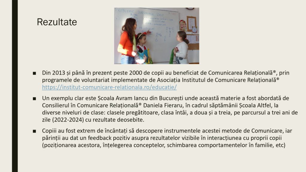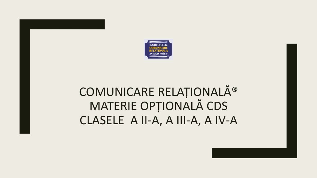 Aici găsesti resurse valoroase pentru a le putea implementa la clasă în lucrul și activitățile cu copiii. Metoda Comunicării Relaționale® folosește concepte și instrumente din Științele Comunicării, Științele Psihologiei, Științelor Cognitive și din domeniul Neuroștiințelor. Pentru a o preda la clasă este nevoie să intri în programul de formare în Comunicare Relațională pentru Profesori. Gasești toate informațiile în această pagină.